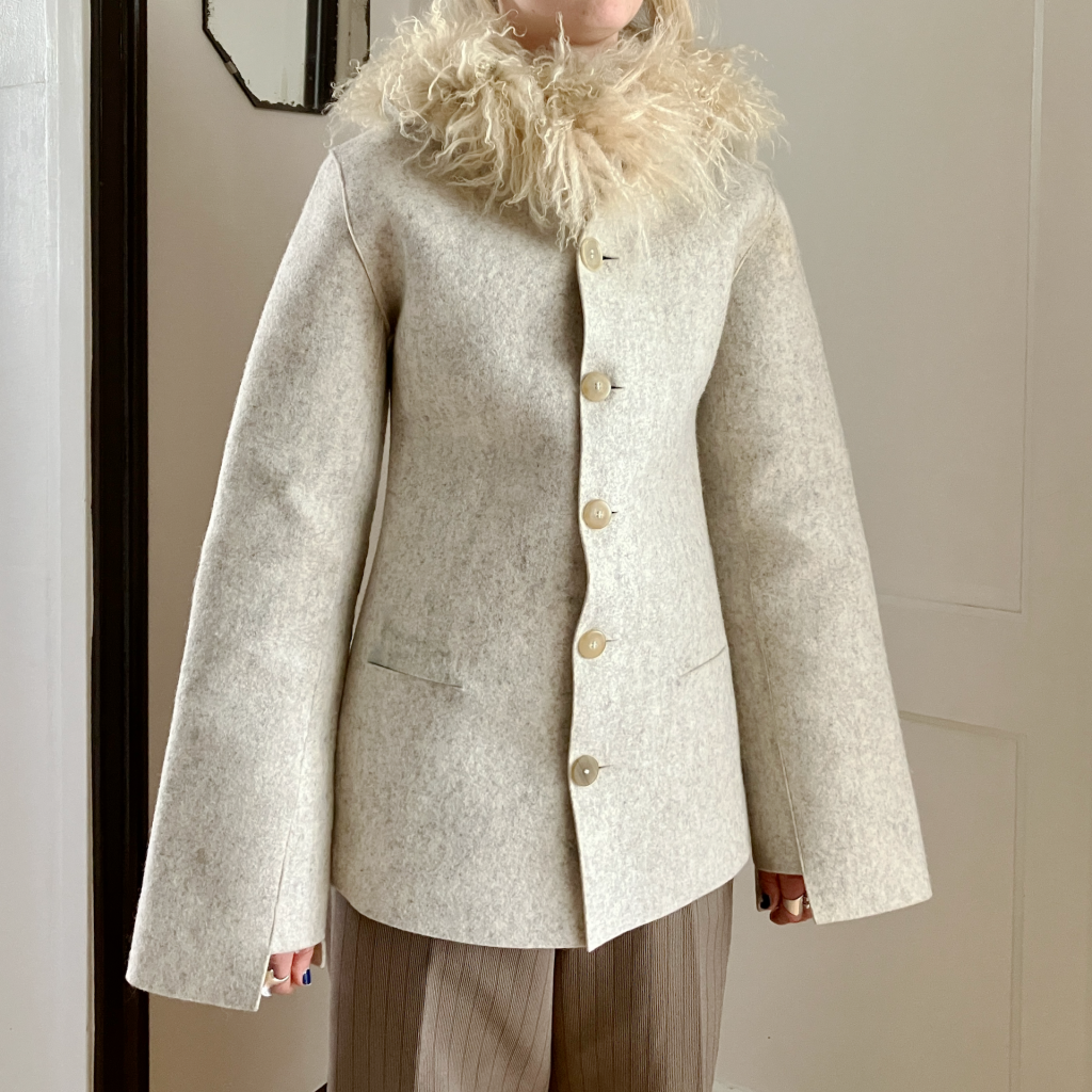 extra warm in winter sewn from very thick felted wool with pockets and fluffy woolen collar and button closure. ’23